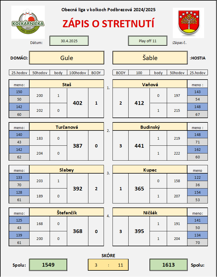 Semifinálový zápas 3 Gule Šable mix - odveta 30.04.2025 20:21 Prvý zápas Šable Gule 10 : 4 , celkom na zápasy 2 : 0, na setové body 21 : 7, do finále postupuje družstvo Šable mix, do súboja o 3. miesto postupuje družstvo Gule.