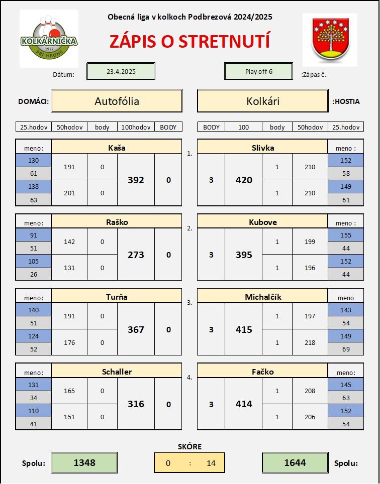 PLay off 6 Autofolie - Kolkári 24.04.2025 06:31 Prvý zápas Kolkári Autofólie 10 "4, celkom na zápasy Kolkári Autofólie 2 : 0 na setové vody 24 : 4. Do semifinále postupuje družstvo Kolkári