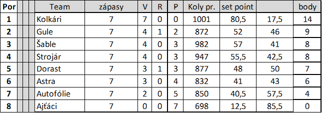 Na čele tabuľky sú Kolkári, ktorí v 1.časti nenašli premožiteľa a vedú o 5 bodov pred Guľami a o 6 bodov pred Šabľami a Strojárom. Poslední sú Ajťáci zaťiaľ bez bodového zisku, ale s novými skúsenosťami.