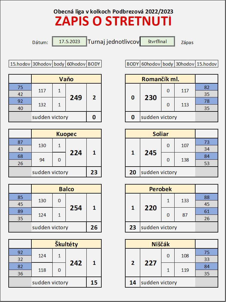Štvrťfinále turnaja jednotlivcov 17.05.2023 18:53 Veľmi dramatické štvrťfinál*e, kde v troch zápasoch rozhodol rozstrel a dokonca v jednom aj pred=lžený roztrel. De semifinále postupujú - Vaňo, Kupec, Balco, Škultéty.